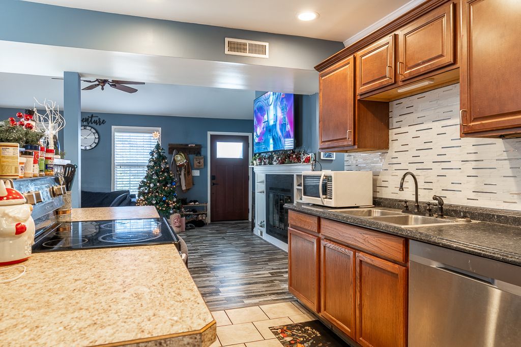 Move right into this charming single level brick ranch with main level double car oversized garage! Pulling up the paved drive to the oversized two car garage you'll be greeted by mature trees. Spacious rooms throughout the home and adorable Primary Suite! The kitchen is perfect for chefs and entertainers with space for plenty friends or family to the open den with the cozy fireplace. Convenient to the main level laundry room and garage. Tasteful updates throughout the home will make it easy to personalize to your style. Covered porch overlooks the fenced in and shady backyard. The Covered front porch is a great place to sip on a little something and wave at your neighbors. Additional room for storage off the garage for tools, hobby, or toys. HVAC replaced in 2022 and showings start on July 11th so schedule your future visit today!